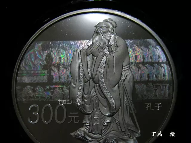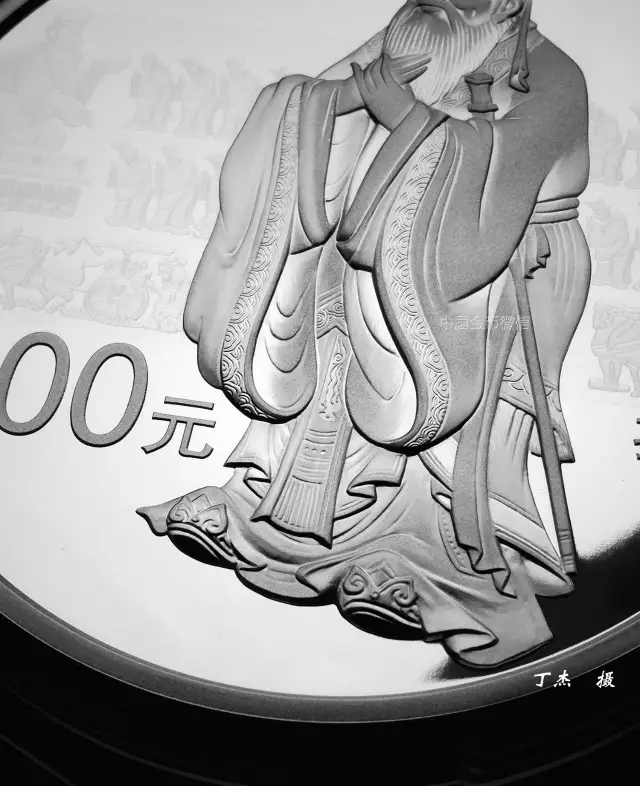 银币的塑造上,可以说是形象的洒脱与精神的谦卑并存,孔子作为两千多年前一个真实的历史人物,其精神世界的博大波澜,通过银币画面上这个人物的姿态曲线和面部表情被精妙地表达出来,呈现在我们面前的是一个真实的,属于历史的孔子。