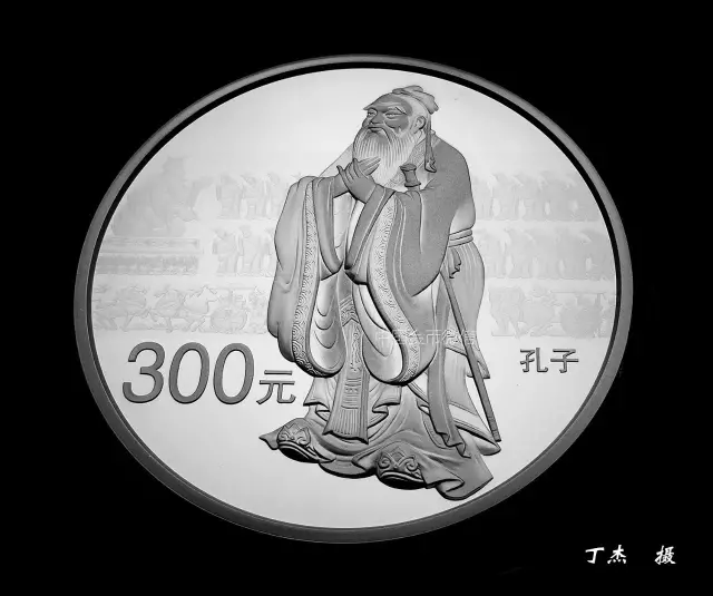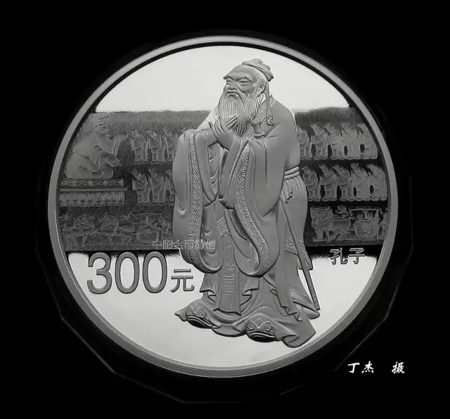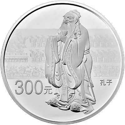 1公斤银币的背面图案为孔子行教像,衬以杏坛讲学和周游列国画像石图案组合设计,并刊“孔子”字样及面额。