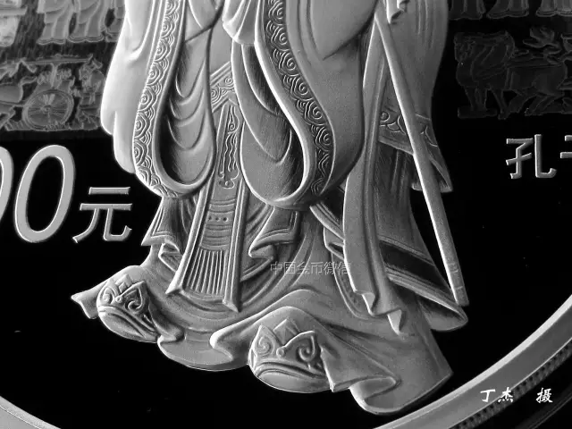 虽然在这枚银币画面上,孔子形象所占据的版面并不是很大,但就整个画面而言,他占据着画面的中心,是币眼之所在,因此吸引着欣赏者的全部视线。币面孔子形象刻画的栩栩如生,局部刻画细腻、精致。