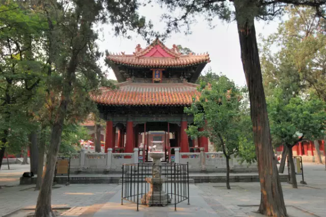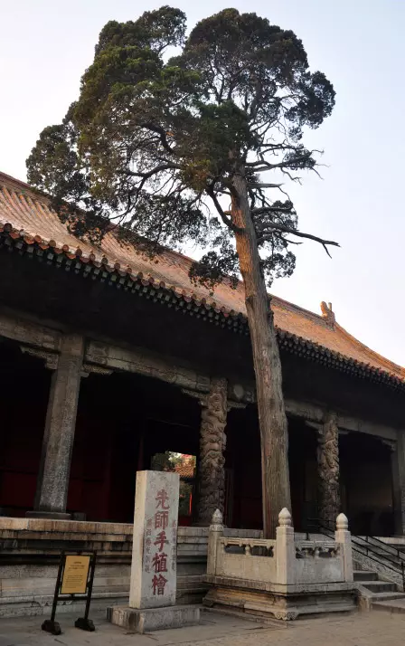 在曲阜孔庙主体院落大成门内,有一棵挺拔高耸的桧树。相传这是孔子亲手栽下的。坛前有四棵杏树,相传这是孔子当年坐在坛上弦歌讲学、弟子读书的地方。